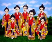 中国文化の影響を大きく受けて醸成された琉球(沖縄)は、島全体を覆うデザイン・色彩においても日本のどの地方とも異なる独特のものをもっている。 華やかさを誇る伝統の琉装も、下着から着付けまで、道具も手順も和装とはちがう。 古典琉舞で美しい踊りとともに披露される特別な染めの正装はすばらしく、沖縄の舞台衣装の最高峰としてステージのグレードを高めている。 文化祭など街のお祭りで着る琉装もまた、南国そのものを表現したかのように底抜けに明るく楽しい。 琉球のお姫様役に選ばれたお嬢さんから堂々たる琉舞のお師匠さんまで、沖縄の女性たちは賑やかで明るく、暖かい。 着物の色・柄と見事なまでにピッタリだ。 |