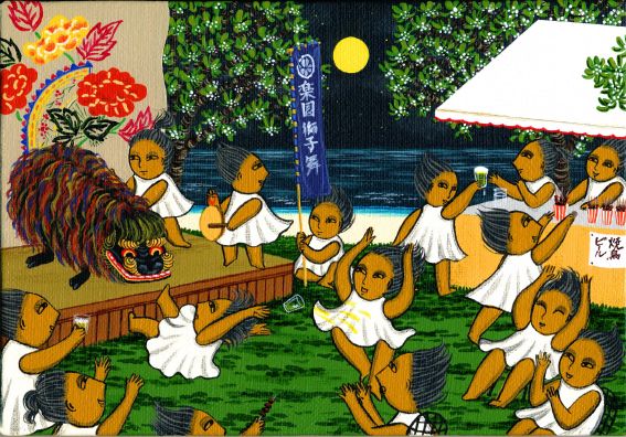 on the fall night of full moon. Here in Tera-cho,Shuri where KYOKOART Gallery locates on,local young guys perform the 500years traditional shi-shi-mai as the successors. We look forward this event in a full moon night every year.Respectable. |