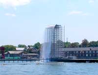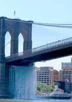 Eliassonはアーティストステイトメントの中で、「人間にとって必要不可欠な水が大自然の中で作り出す現象である滝を、あえてニューヨークビル群を背景とする“建築(構築)物”として再現させた。それにより、誰もが渇望する大自然を都会に居ながらにして体験し、各々が環境を考える機会になる」と記している。4ヶ所の滝は橋の下、川岸に近いものとがあり、ごく普通のビルの建材(足場、ポンプ、パイプ)などで水の循環を作り出している。 それぞれに周りの都会光景とマッチしているが、川面からひときわ高くそびえる足場の先端から落ちる滝は、人工的な建材ががっしり堂々と透けて見えるがゆえに、わざわざ遊具を頑丈に作ってくれた ような楽しさがある。水のある光景を人は常に夢みる。人工的なプールやせせらぎ、大海や、大自然の川や湖ならなおのこと。 体内でも体外でも、人間は水を必要としているのだ。 真夏のNYは冗談抜きで水のボトルなしには歩けない。船上で、雄大な滝の姿を見、音を聞きながらミネラルウォーターをごくごく飲む。 滝を飲んでいるような気がした。 |